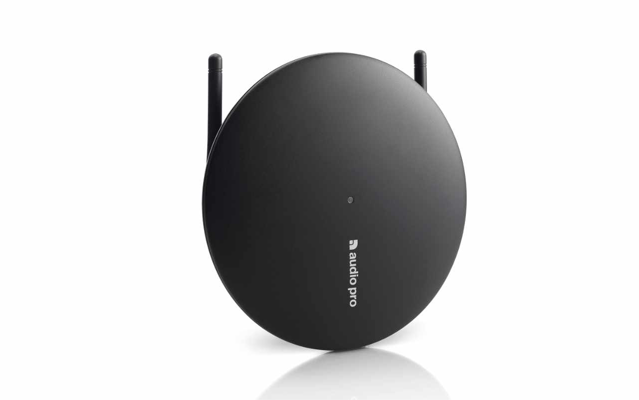 Der kabellose Sender ist das Herzstück des Systems. Er überträgt den Sound und steuert die Lautstärke der Lautsprecher.